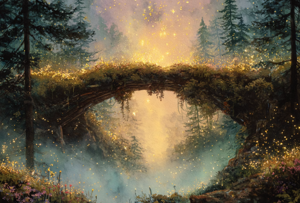 Ihr lauft weiter durch den Wald und kommt zu einer hohen Schlucht. Unten funkelt ein nebelverhangener Abgrund. Über die Schlucht führt eine schmale, magische Brücke aus altem Holz.