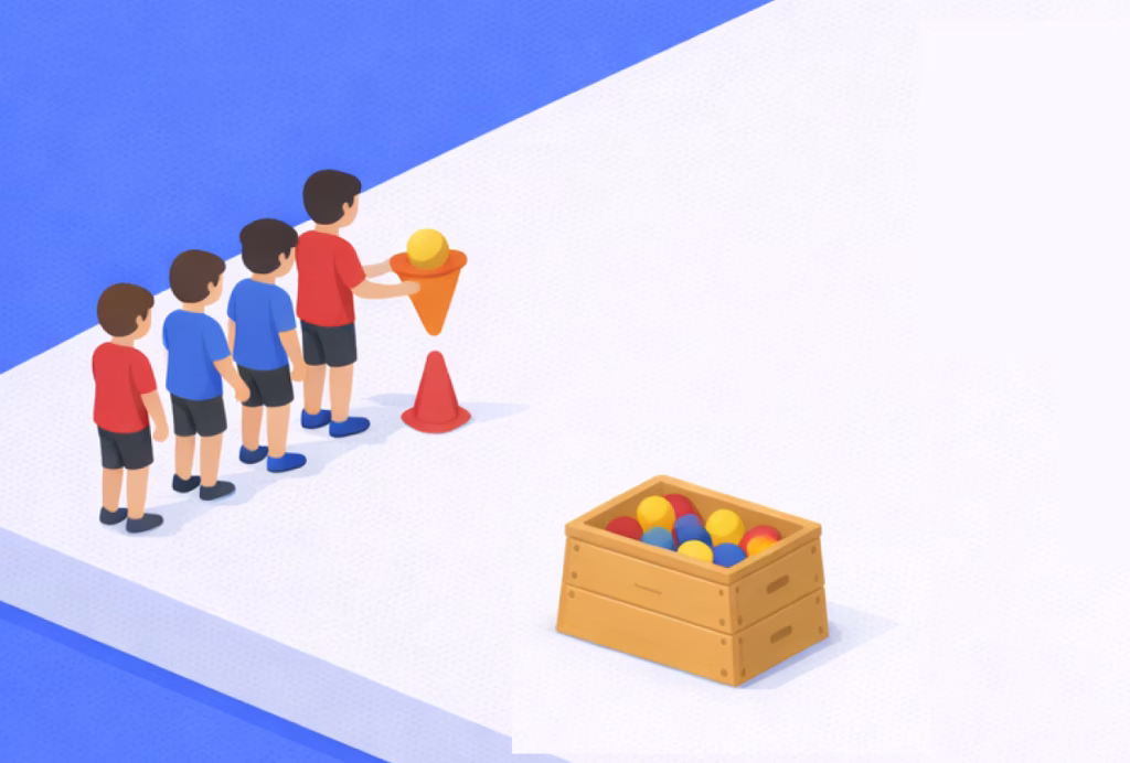 Ein umgedrehter Kasten mit Bällen steht in der Mitte zwischen den Teams.